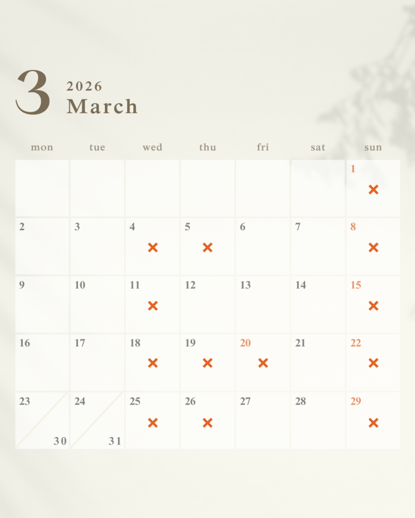 お知らせ 2026.03.02 〈3月のおしらせ〉 寒暖差が大きいと身体にもこたえます。また、風邪を引きそうなときや、熱は引いたけど喉や咳だけ残るような場合はお身体を元気にする鍼灸がおススメです。春は気温差や環境の変化で、知らないうちに自律神経も疲れやすい季節。イベントの多い3月~4月を元気に過ごせるようにぜひご自身のケアにお越しください。 立春~からだは動き出したがっています~ 前の記事